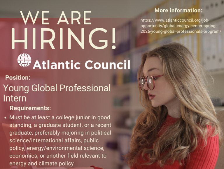 Applications are open for the Atlantic Council Global Energy Center – Spring 2026 Young Global Professionals Program. The Atlantic Council’s Global Energy Center (GEC) develops and promotes pragmatic and nonpartisan policy solutions designed to advance global energy security, enhance economic opportunity, and accelerate pathways to net-zero emissions. The Young Global Professionals (YGP) provide important research and logistical support to the Center. They are also encouraged to participate in and attend events hosted by other programs at the Atlantic Council.