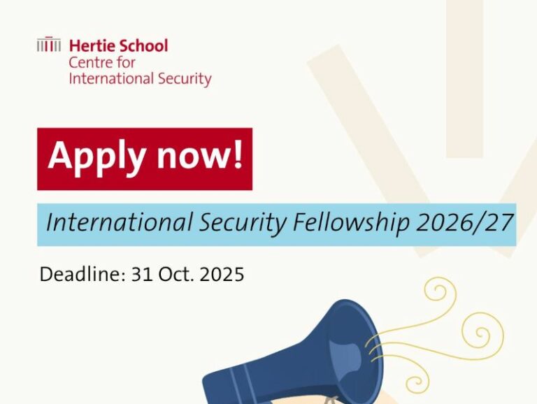 Applications are open for the Centre for International Security at the Hertie School International Security Fellowship 2026/2027. The Centre for International Security at the Hertie School offers non-stipendiary fellowships for researchers. This fellowship is destined for researchers working on topics related to the four core research areas of the Centre: nuclear policy, states and non-state actors, grand strategy, and digital technology and security.
