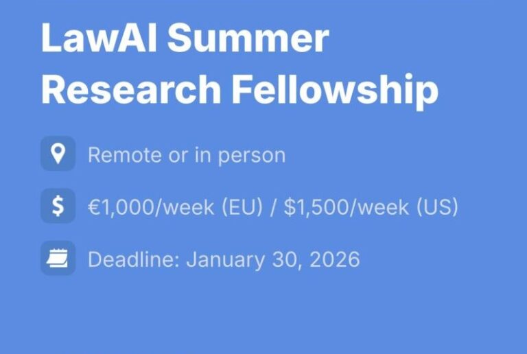Applications are open for the Institute for Law & AI’s Summer Research Fellowship 2026. The Institute for Law & AI’s Summer Research Fellowship (US) is a paid program that offers law students, professionals, and academics the opportunity to work at the leading edge of AI law and policy, with a particular focus on United States Law and Policy.